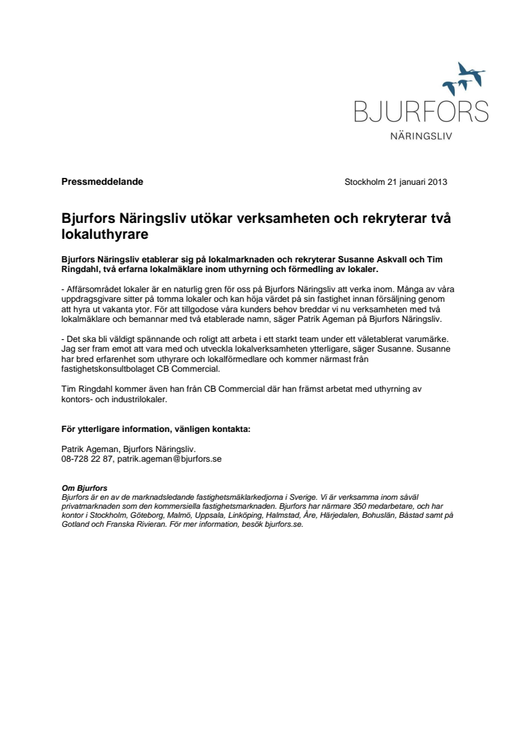 Bjurfors Näringsliv etablerar sig på lokalmarknaden och rekryterar Susanne Askvall och Tim Ringdahl, två erfarna lokalmäklare inom uthyrning och förmedling av lokaler. - Affärsområdet lokaler är en naturlig gren för oss. Många av våra uppdragsgivare har tomma lokaler och kan höja värdet på sin fastighet innan försäljning genom att hyra ut vakanta ytor. säger Patrik Ageman på Bjurfors Näringsliv.