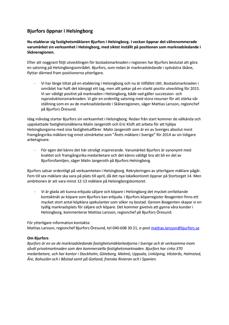 Nu etablerar sig fastighetsmäklaren Bjurfors i Helsingborg. I februari öppnar det välrenommerade varumärket sin verksamhet i Helsingborg, med siktet inställt på positionen som marknadsledande i Skåneregionen.