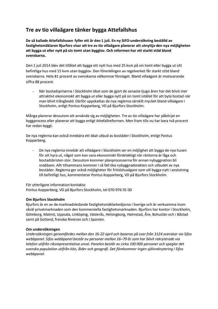 De så kallade Attefallshusen fyller ett år den 1 juli. En ny SIFO-undersökning beställd av fastighetsmäklaren Bjurfors visar att tre av tio villaägare planerar att utnyttja den nya möjligheten att bygga ut eller nytt på sin tomt utan bygglov. Och reformen har ett starkt stöd bland svenskarna.