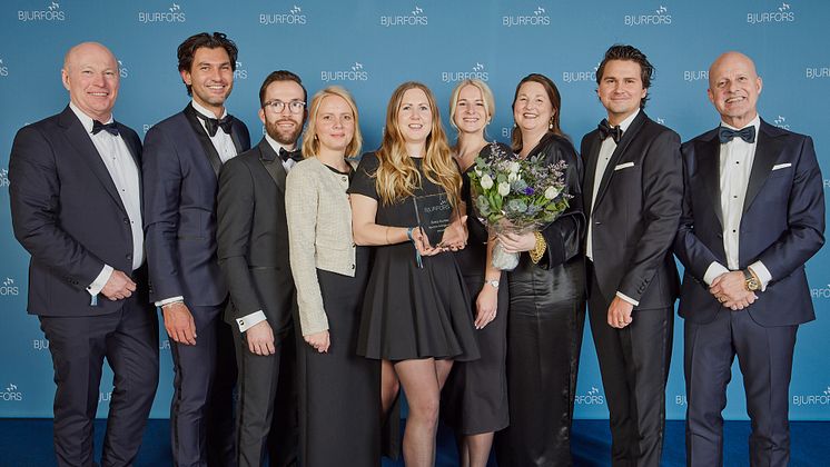 Bjurfors Mölndal: Årets kontor 2024. I bild (från vänster till höger) Sven-Erik Kristensen, vd, Bjurfors Väst, Daniel Adelsson, franchisetagare och mäklare, Philip Salomonsson, mäklare, Linn Eriksson, mäklare, Caroline Enström, mäklarkoordinator, Tove Johansson, mäklare, Sarah Lundgren, mäklarkoordinator, Rasmus Broström, mäklare samt Mats Ljung, ägare.
