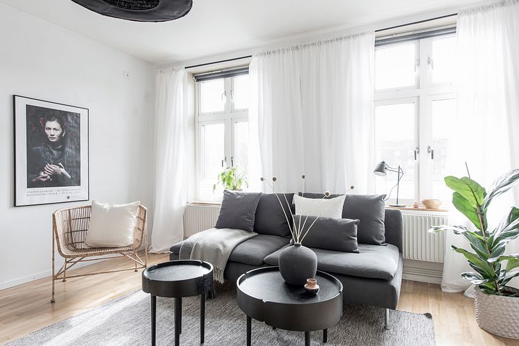 Modern vardagsrum med avskalade detaljer, Amiralitetsgatan, Göteborg.