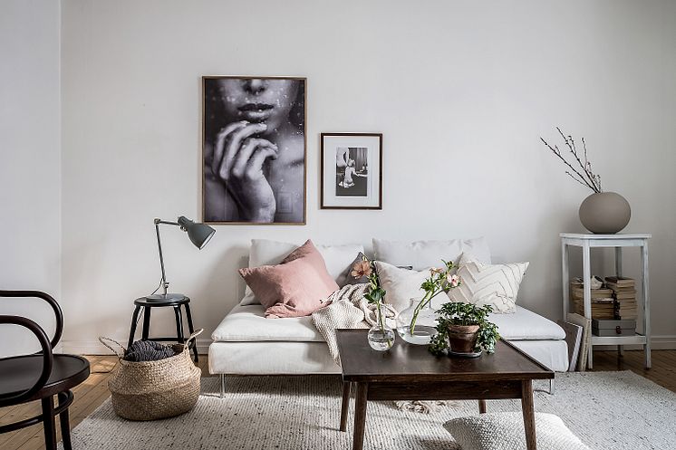 Ljust vardagsrum med modern konst på väggarna, Stockholmsgatan, Göteborg.