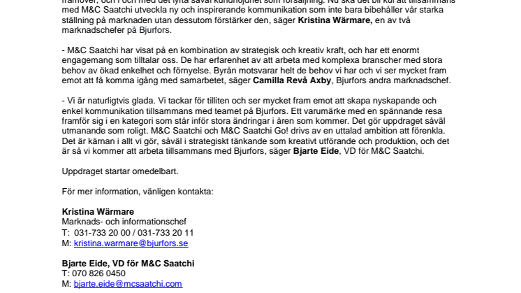 - Vi är naturligtvis glada. Vi tackar för tilliten och ser mycket fram emot att skapa nyskapande och enkel kommunikation tillsammans med teamet på Bjurfors. Ett varumärke med en spännande resa framför sig i en kategori som står inför stora ändringar i åren som kommer. Det gör uppdraget såväl utmanande som roligt. M&C Saatchi och M&C Saatchi Go! drivs av en uttalad ambition att förenkla. Det är kärnan i allt vi gör, såväl i strategiskt tänkande som kreativt utförande och produktion, och det är så vi kommer att arbeta tillsammans med Bjurfors, säger Bjarte Eide, VD för M&C Saatchi.