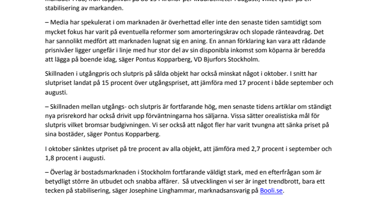 – Överlag är bostadsmarknaden i Stockholm fortfarande väldigt stark, med en efterfrågan som är betydligt större än utbudet och snabba affärer. Så utvecklingen vi ser är inget trendbrott, bara ett tecken på stabilisering, säger Josephine Linghammar, marknadsansvarig på Booli.se.